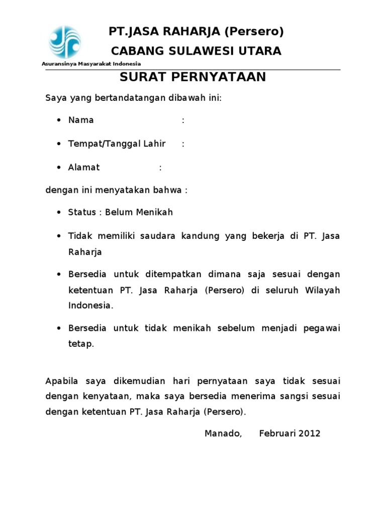 Surat Keterangan Bersedia Tidak Menikah Selama Magang Jasa Raharja / Contoh Surat Pernyataan Tidak Menikah / Tahapan seleksi loker jasa rajarha karir.. Menguasai operasional komputer (minimal ms. Belum menikah dan sanggup tidak menikah selama menjadi peserta. Lalu, pelamar harus menguasai operasional komputer minimal microsoft word dan bila memenuhi kriteria itu, calon magang bisa memasukkan syarat lamaran di situs resmi langkah bakti jasa raharja. Tidak memiliki orang tua dan/atau saudara kandung yang masih aktif bekerja di pt jasa raharja. Surat pernyataan dapat diunduh pada website.